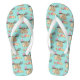 Flip flops with a repeating pattern. Designed with an illustration of a cute brown sloth hanging upside down. This funny little guy is holding onto a branch which has a little pink bird on one side of the branch and a doodle-style rose bouquet on the other side. Below them is an arrangement of colourful hand-drawn flowers. This adorable sloth also has pink rosy cheeks and 3 cute little hearts on his butt. A light aqua background colour.