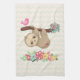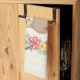 A kitchen towel with an illustration of a cute brown sloth hanging upside down. This funny little guy is holding onto a branch which has a little pink bird on
