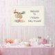 A baby shower / birthday event banner with an illustration of a cute brown sloth hanging upside down. This funny little guy is holding onto a branch which has a little pink bird on one side of the branch and a doodle-style rose bouquet on the other side. Below them is an arrangement of colourful hand-drawn flowers. This adorable sloth also has pink rosy cheeks and 3 cute little hearts on his butt. The background has a light yellow wavy striped pattern.