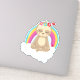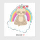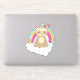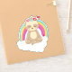 A cute cartoon illustration of a meditating sloth. Wearing a crown of wildflowers on its head, floating peacefully on a white cloud with a colourful rainbow behind. A couple of hearts nearby. Peaceful and happy.