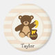 Cool, retro, colourful kid's Cute Brown Teddy Bear with Yellow Honey design on white stripes, striped pattern with vintage feel. Perfect gift for baby, toddler, kids, children, teens, or adults! Personalised the design by adding a child's name or custom text. Visit our store, Birthday Party House, for more great customisable boy and girl products and room decor!