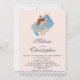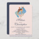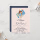 A pretty brown deer with a white spotted back. A little bird sitting on the deer's back. A fancy floral bouquet in pastel pink and green. A blue rectangle behind the image. A polka dot border along the bottom. Innocent and sweet design. Personalise with your wedding details.