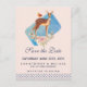Save the date postcard designed with a pretty brown deer with a white spotted back. A little bird sitting on the deer's back. A fancy floral bouquet with watercolor roses and light olive green leaves under the deer's feet. A blue watercolor rectangle behind the image. A polka dot border along the bottom. Innocent and sweet design with rustic elegance. Peach coloured background.
