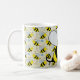 A big yellow and black bumble bee with a bee pattern with some flowers, hearts, swirls, twirls, and bee trails.
