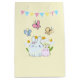 A gift bag with a colourful bunting banner stretching across the top. Illustrated with a cute mum and baby bunny standing together. Yellow daisies in the background. Whimsical butterflies fluttering about. Pale yellow background colour.