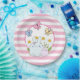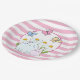 Paper plates with a pink and white striped background. A white circular frame with a pink border layered over top. Inside the frame an illustration a mum and baby bunny standing together. Yellow daisies in the background. Whimsical butterflies fluttering about.