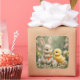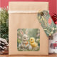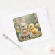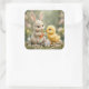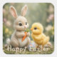 Adorable bunny and yellow chick sitting in a spring meadow with "Happy Easter" text, creating a warm and festive holiday atmosphere.