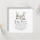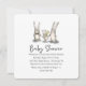 Cute bunny rabbit family illustration with modern hand script baby shower invitation, featuring a soft grey colour back of the card.