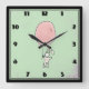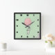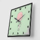 A square clock with a whimsical bunny holding a big pink balloon floating up in the air. Set on a light green background.