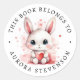 Bookplate labels featuring a cute watercolor painting of a little bunny holding a red heart and customisable text "this book belongs to" and your name on a white background.