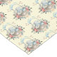 A patterned table runner with an illustration created with watercolors. A cute bunny rabbit wearing a blue dress sitting in a basket surrounded by her eggs. Butterflies flutter around the basket which is decorated with a fancy flower bouquet.