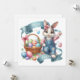 A delightful Easter-themed illustration featuring a playful bunny with a cheerful expression. The bunny is wearing denim overalls with ripped details, paired with a pink-and-white striped shirt. A matching pink bow decorates its head. The bunny waves enthusiastically, surrounded by a blue ribbon banner that reads "Happy Easter." Beside it is a basket filled with colourful striped and patterned Easter eggs, adorned with a pink bow.