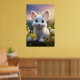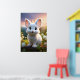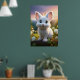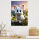 Poster of a cute white rabbit with big blue eyes and fluffy fur siting amidst white flowers and green foliage, with a soft sunset in the background. The scene evokes a sense of warmth and serenity.