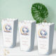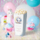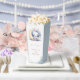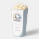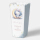 Super cute pop corn favour box featuring cute white little bunny wearing a beautiful blue bow sitting on a lovely moon with some gold falling stars and some dusty blue clouds.