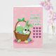This design shows a cartoon bunny in bright lime green peeking out of a rustic, woven brown basket, giving the scene a friendly, affectionate feel 🐰. Its big dark eyes and rosy pink nose are drawn with a tender softness, as if it’s leaning forward to greet someone it cares about. Long upright ears frame its face, and a small fluffy white tail shows just above the basket rim. A leaf-shaped bow in matching green decorates the basket, tying the character and setting together. Around and inside the basket sit striped egg shapes in purple, yellow, light blue, and green, scattered like little surprises from a springtime search 🌷. The background is a muted pink with faint, layered circular patterns that add gentle texture without distracting from the main figure. On the right side, a seasonal greeting appears in teal with darker green accents, set above a neat grid of deep purple heart icons. The basket’s weave lines are detailed and slightly shadowed, and the eggs’ stripes are crisp against the soft pink backdrop.