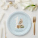 Celebrate your child's first birthday with these cute bunny birthday plates. The design features a bunny unwrapping a birthday present. There is a white number 1 with colourful polkadots behind him. The background is a subtle light blue pattern. You can personalise these plates with a name.