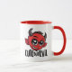 Vector cartoon illustration of a devilishly cute little devil with big eyes with Cute But Evil text. Keywords: devil, hell, cute, demon, evil, satan, halloween, monster, horns, horror, adorable, sweet, devilishly, devilish, precious, endearing, loveable, lovely, appealing, engaging, delightful, dear, darling, winning, winsome, charming, enchanting, attractive, pretty, adorbs