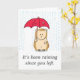 A cute but pitiful hedgehog is drenched standing in the heavy rain as it has a torn red umbrella. Message on cover reads "It's been raining since you left." Text inside reads "I miss you." Let the special someone knows just how much you miss him or her.
