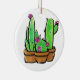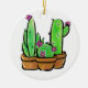 An illustration of three cute cacti with pink flowers in little terracotta pots.