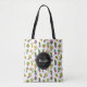 A tote bag with a cute and fun pattern. Illustrations of different cactus, sitting in flower pots with cartoony happy smiling faces. Personalise with a name and initial inside a black circle.
