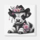 Illustration of a young black and white cow, styled with a decorated hat and floral accents, evoking themes of nature, innocence, and beauty through its charming composition and artistic presentation.