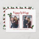Festive holiday design featuring cute custom calligraphy script red "happy holidays" greeting with bright green and red holly embellishments and two-photo template. Back features complementary holly pattern with blank label and suggested greeting.