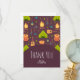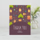 A flat thank you card with a fun camping themed pattern. Set on a reddish brown background. Elements in the pattern include a campfire, a tent,. a guitar, a shovel and backpack. Personalise a name on the front and a message on the back.