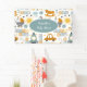 Add a cute custom touch to your baby shower with this adorable baby boy banner sign. Banner has a colourful pattern of a sun, moon, stars, baby carriage, toys, rocket ship, car, rocking horse, and more. Blocks spell out Baby Boy and there's a place to add a first name or other text.