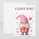 cute card with a cartoon pink gnome in love with a heart for the holiday in February on Valentine's Day