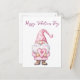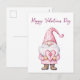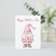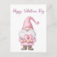 cute card with a cartoon pink gnome in love with a heart for the holiday in February on Valentine's Day