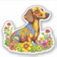 Cute illustration of a wiener dog surrounded by flowers in yellow and pink.