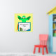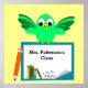 Customize this personalized classroom poster of a cartoon bird on white banner printed with teacher's name, pencil and books in foreground. Text and background color can be changed.