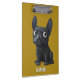 This adorable French Bulldog clipboard features a charming illustration of a black Frenchie sitting against a mustard yellow background. The whimsical style of the artwork adds a touch of fun to any workspace, while the practical design makes it perfect for everyday use. Personalise it with your pet's name for a truly unique and special touch. This high-quality clipboard is durable, functional, and sure to be a delightful addition to your home or office.