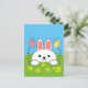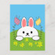 Cute white cartoon bunny rabbit with big pink ears and an adorable face is poking out of his rabbit hole in the green grass. He is surrounded by lots of pretty flowers on a clear spring day.