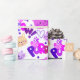 This cute design uses cartoon cats and the words 'purr' and 'meow' with doodle hearts and paw prints.