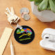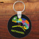 Create a personalised keychain or keyring featuring a cute, cartoon style illustration of a chameleon in bright and vibrant colours set against a black background. Your name appears in bold, lime green lettering.