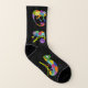 These fun socks feature illustrations of a chameleons in a cute, cartoon style in bright and vibrant colours set against a black background.
