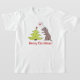 Customisable funny Christmas kid shirt with an illustration of a cute cartoon dinosaur looking at the Christmas tree and wondering why there is a heart on top of it.