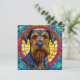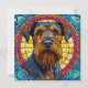 Portrait of a dog with a thick, bushy beard and expressive eyes, framed by a vibrant stained glass-like background in yellow, pink, and blue hues.