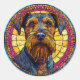 Portrait of a dog with a thick, bushy beard and expressive eyes, framed by a vibrant stained glass-like background in yellow, pink, and blue hues.