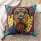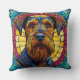 Portrait of a dog with a thick, bushy beard and expressive eyes, framed by a vibrant stained glass-like background in yellow, pink, and blue hues.
