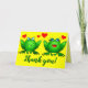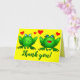 Happy green cartoon frogs with blue eyes, red hearts and a cheerful yellow background. This card says "Thank you!" in a cool dancing script style, and is blank inside so you can write your personal message of wit and wisdom. If you want different words on front, you can change the text right on the product page. Frogs can represent friendship, affection, romance, dreams, music and singing, celebration, happiness, good luck and good health. Send or give this to friends and family, a cute couple, neighbor, teacher or volunteer, or anyone who deserves a heartfelt thanks. This is a hand drawn original frog design by M Sylvia Chaume, Canada. Hoppy Blessings!