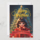 Cute Cartoon Girl Custom Red Ribbon Christmas Card