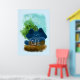illustration of blue fluffy cat hidden behind cute labelled block and morning landscape with tree.