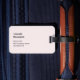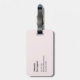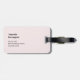 A luggage tag with a cute drawing of a little kitten poking its head out of a gift box.