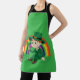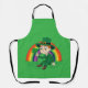Apron with an Illustration of a cute smiling leprechaun wearing a green suit, a top hat while holding a shamrock leaf, with a colourful rainbow in the background