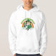 Hoodie with an Illustration of a cute smiling leprechaun wearing a green suit, a top hat while holding a shamrock leaf, with a colourful rainbow in the background and text saying "Happy St. Patrick's Day"