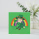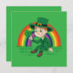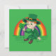 Invitation with an Illustration of a cute smiling leprechaun wearing a green suit, a top hat while holding a shamrock leaf, with a colourful rainbow in the background