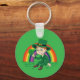 Keychain with an Illustration of a cute smiling leprechaun wearing a green suit, a top hat while holding a shamrock leaf, with a colourful rainbow in the background