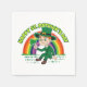 Paper Napkin with an Illustration of a cute smiling leprechaun wearing a green suit, a top hat while holding a shamrock leaf, with a colourful rainbow in the background and text saying "Happy St. Patrick's Day"